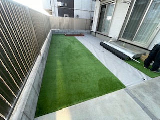 こちらは防草シートを敷き、その上に人工芝を施工しているところです