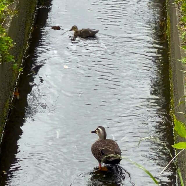 今朝、ショールームのすぐそばを流れる小さな川で、ほっこりする光景に出会いました。