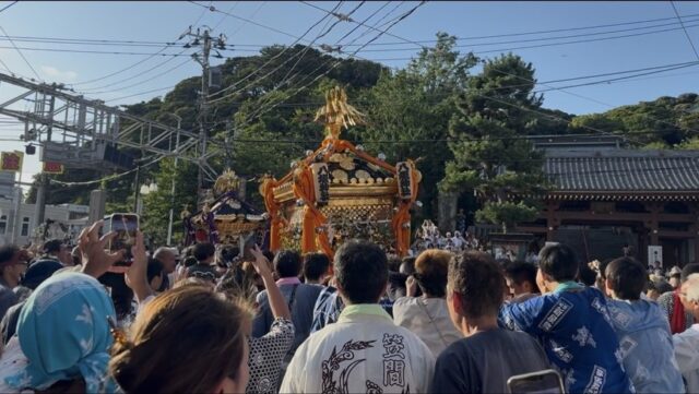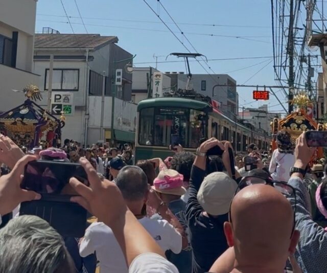その後、神輿(みこし)はそれぞれの神社から出発し、町の中心部である龍口寺前交差点で合流。その瞬間、とっても感動しました!神輿が道の両側に寄って電車を通す場面も。これが腰越ならではの名物シーンです。実際に目の前で見た迫力と緊張感は格別です!