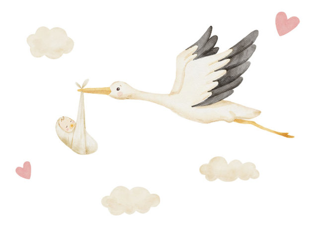 Cute stork flies and carries newborn baby in clouds. Watercolor illustration isolated on white.