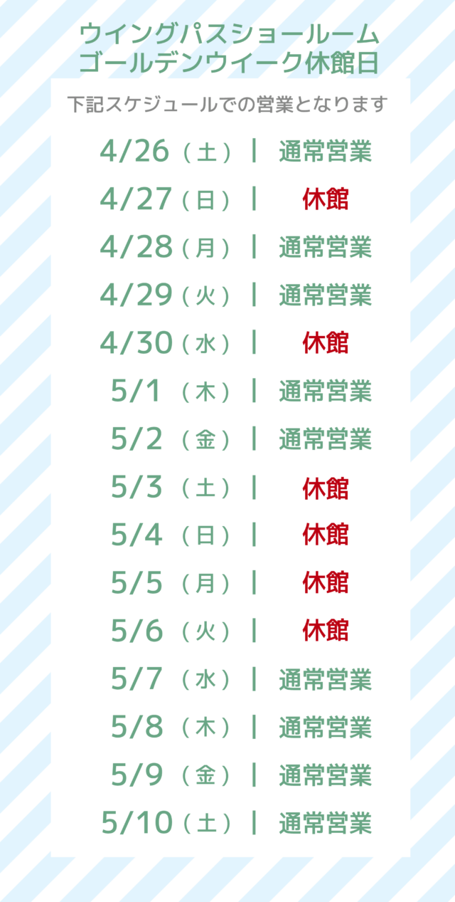 【ウイングパスショールーム ゴールデンウイーク休業のお知らせ】