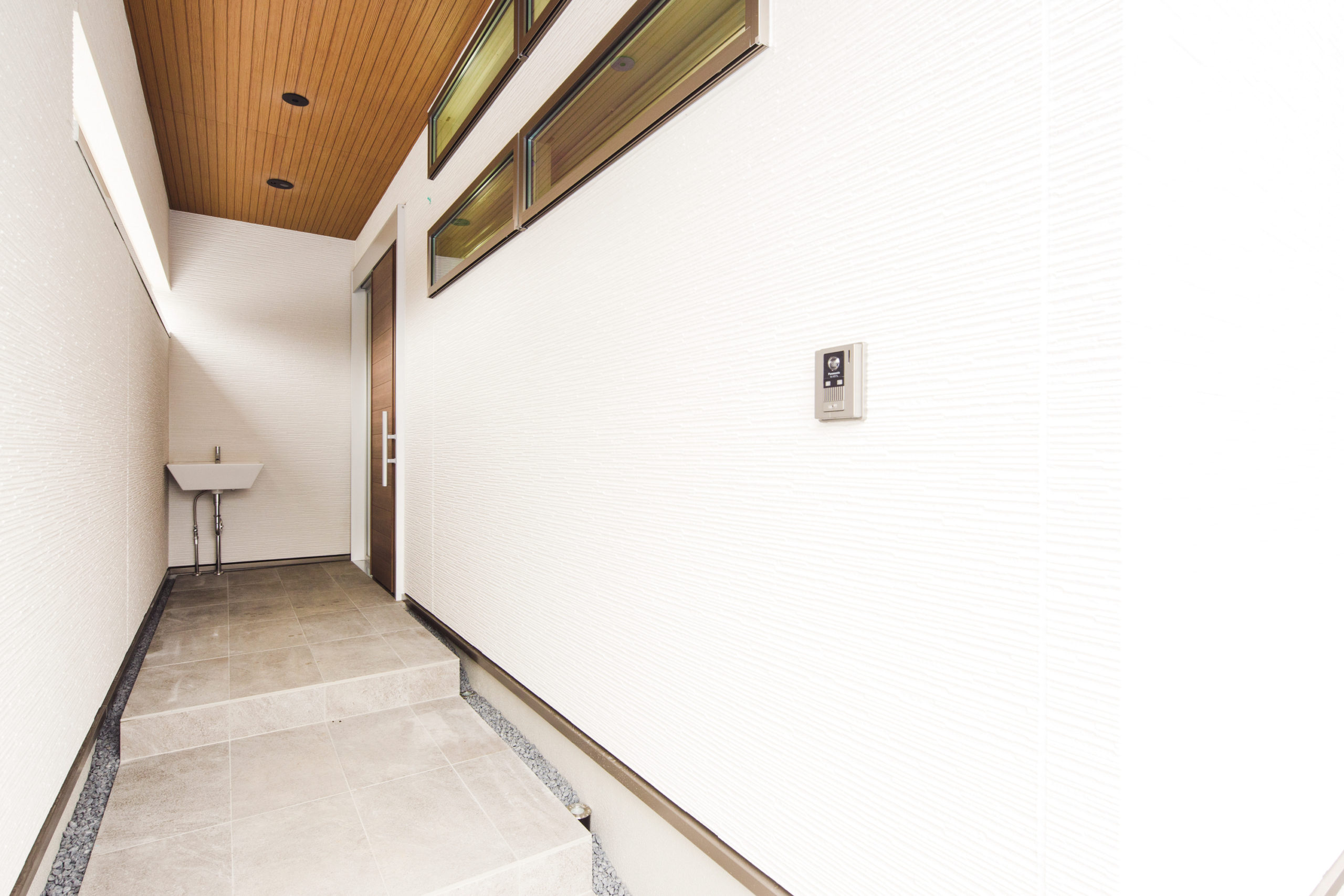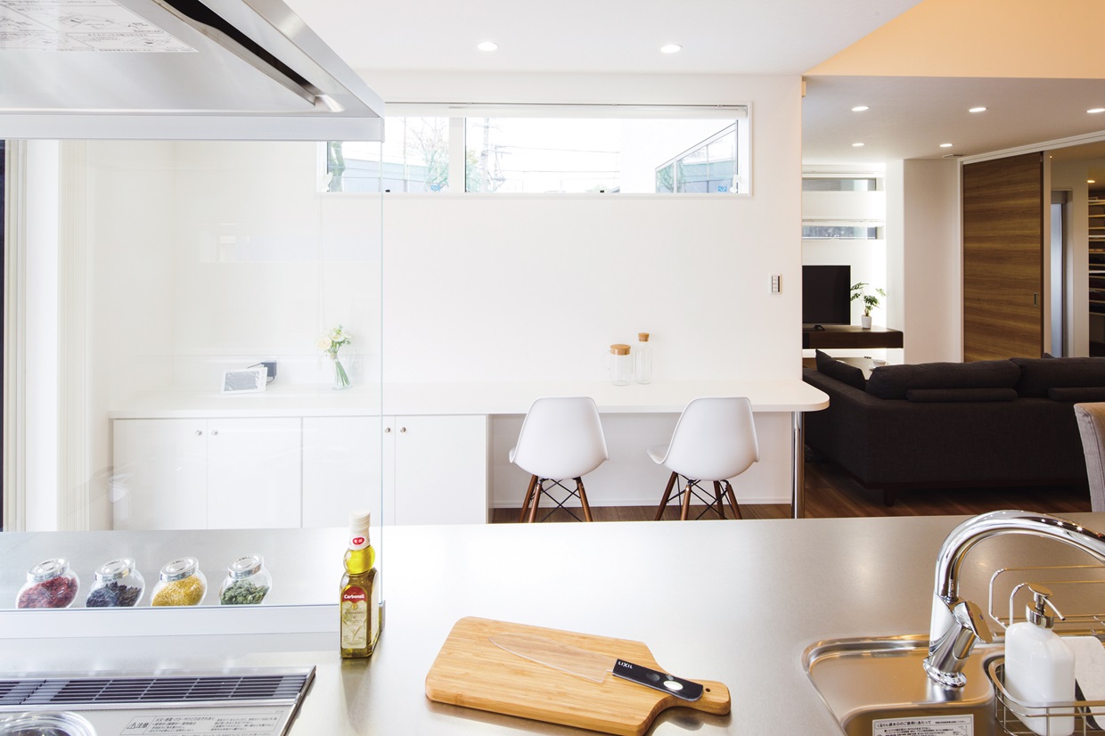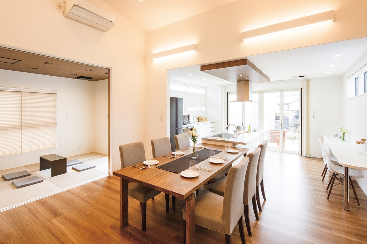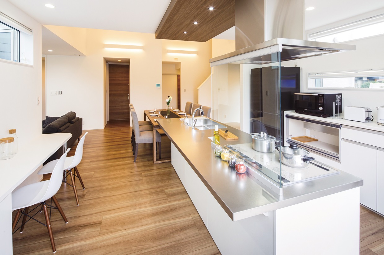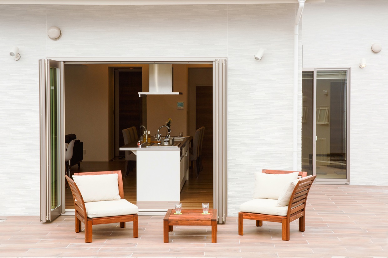 玄関まで続くトンネルのようなアプローチ。 あえて南側に配した、明るいキッチンが主役のL D Kとウッドデッキ。 仲間が集う週末は素敵なおもてなし空間になります。