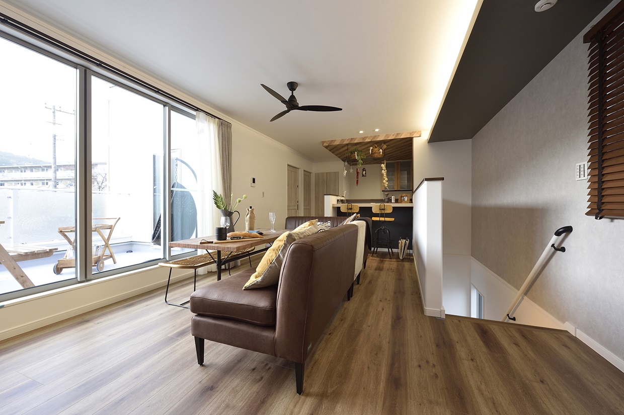 柔らかな陽の光が差し込み、爽やかな風がそよぐ開放感あふれる2階リビングのある家。