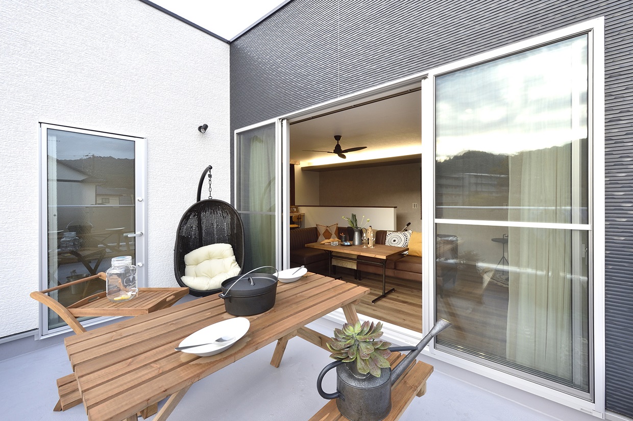 大きな窓の向こうには広いバルコニーがつながり、天気の良い日にはアウトドアも楽しめる