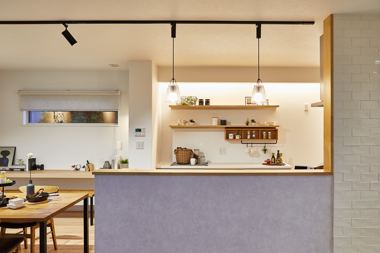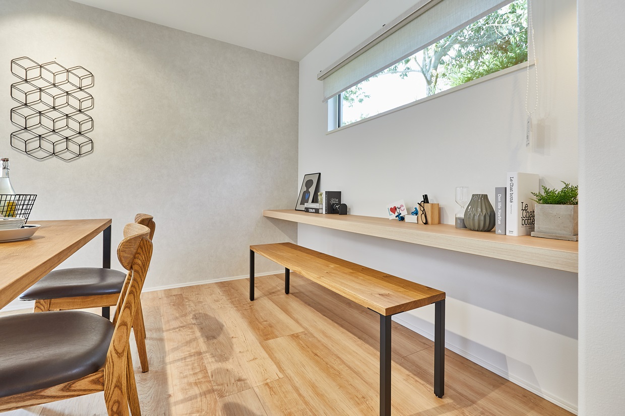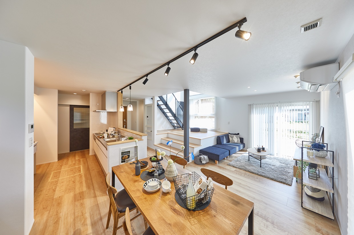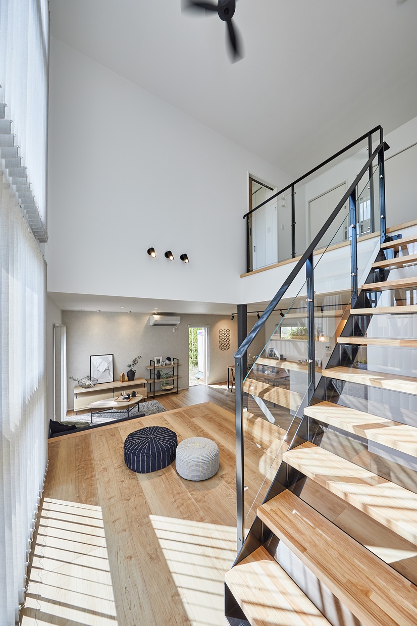 食事も寛ぎのひとときもゆったりと過ごせるリビングは、 気の合う友達を招いてホームパーティーを楽しめるゆとりの広さ。 遊び心あふれるスキップフロアや高い吹き抜けはわが家の自慢の空間です。