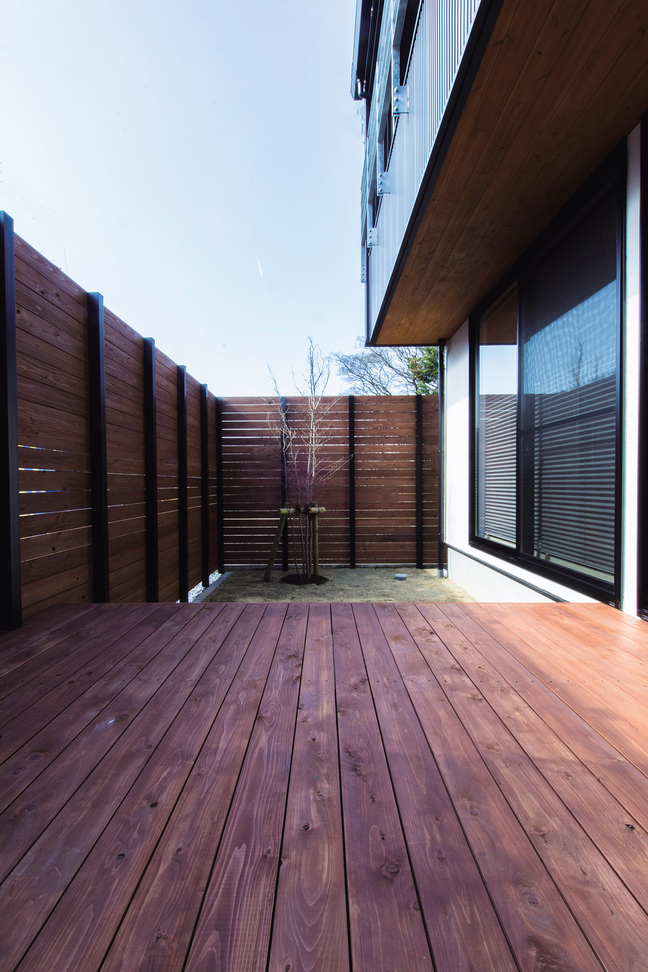 ガルバリウムの黒と塗り壁の白、そして木の茶色が織りなすモダンな外観。 異なる素材が美しく調和することで、上質な格好良さを演出します。 南側に大開口のあるリビングはウッドデッキへと繋がり、風と光をふんだんに採り入れながら、 心地良く暮らせる開放的な空間を作り出します。
