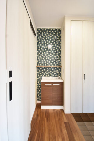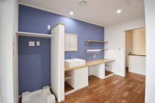 ブラックでシックにまとめた外観は木目の玄関ドアがアクセント。内観は明るくナチュラルな雰囲気に。 こだわったのは家事動線。 洗う→干す→畳む が最短で完了しちゃいます♪